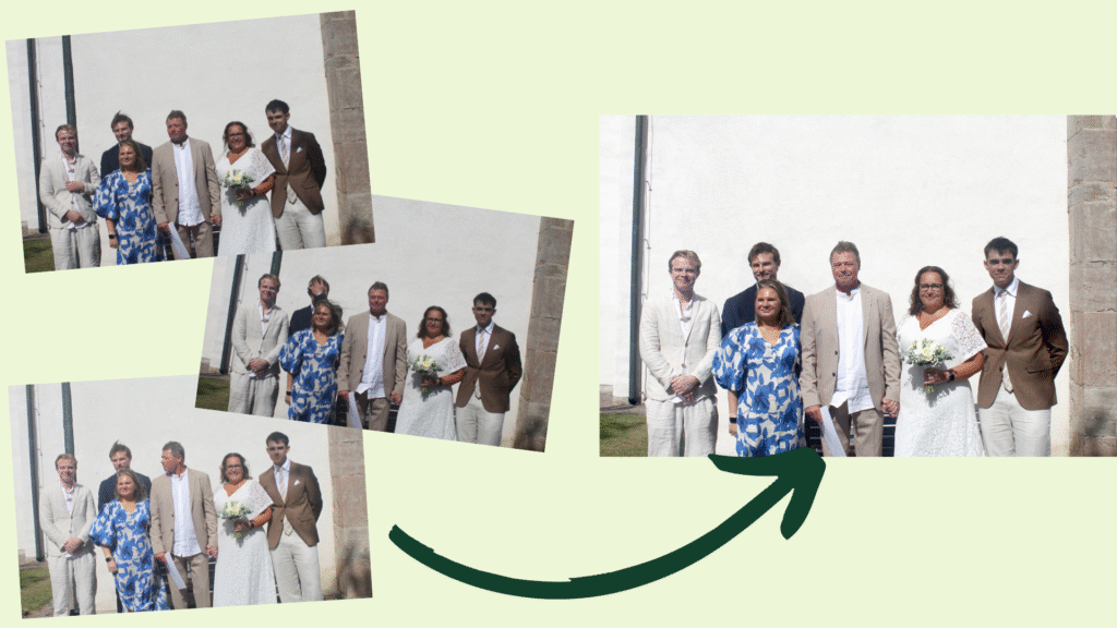 The couple really wanted a full family portrait, but the wind wasn’t on our side that day. No single shot captured everyone looking at the camera without hair in their face, so during editing I combined several photos to create a family portrait where everyone looked their best.